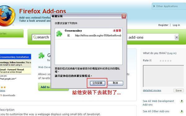g. 打開 Firefox 將上面四個檔案,一個一個『直接拖曳』到Firefox的視窗當中,會出現下方的視窗,選擇安裝。