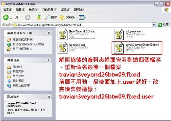 f. 解壓縮後的資料夾裡面會看到四個檔案,其中有一個 travian3beyond26btw09.fixed 檔名後面加個 .user,如下圖。
